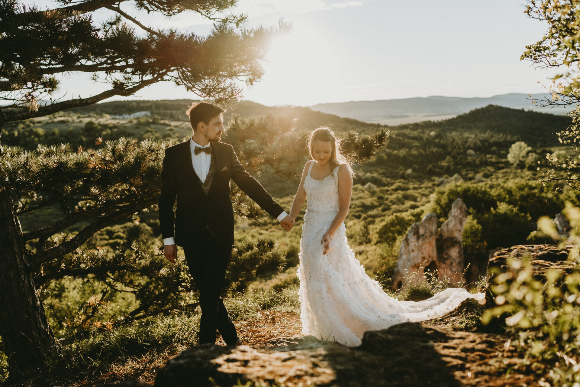 Ez a kreatív esküvői galéria Budapesthez közeli helyszínként kiemeli a Teve Szikla egyedi lehetőségeit a romantikus portréfotózáshoz, a naplementés fények adta hangulatot és a részletfotók apró szépségeit.